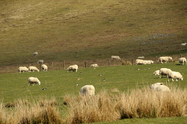 The oyster catchers were enjoying lunch with a flock of sheep.